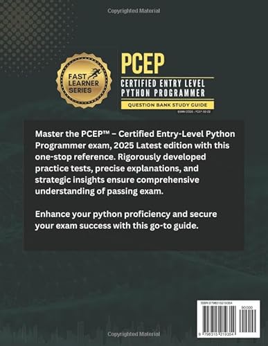 Python PCEP – CERTIFIED ENTRY-LEVEL PYTHON PROGRAMMER, QUESTION BANK STUDY GUIDE, EXAM CODE – PCEP-30-0X, FAST TRACK PREPARATION, 8 PRACTICE TESTS, 360 … ALERTS, CONCISE AND CLEAR EXPLANATIONS June 1, 2025 admin Price: $25.00(as of Jun 01, 2025 11:43:02 UTC – Details) Related